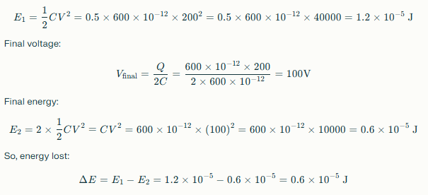 Q11. 600 pF capacitor charged by 200V, disconnected, connected to an uncharged 600 pF capacitor. How much energy lost?